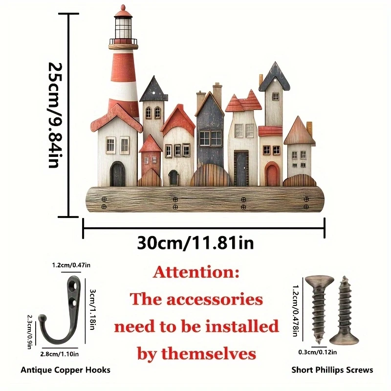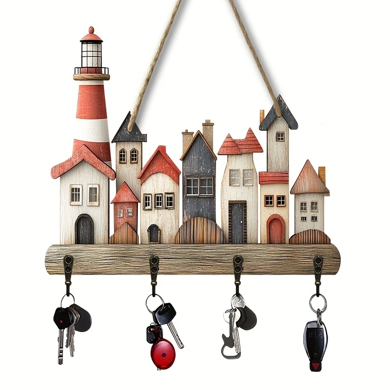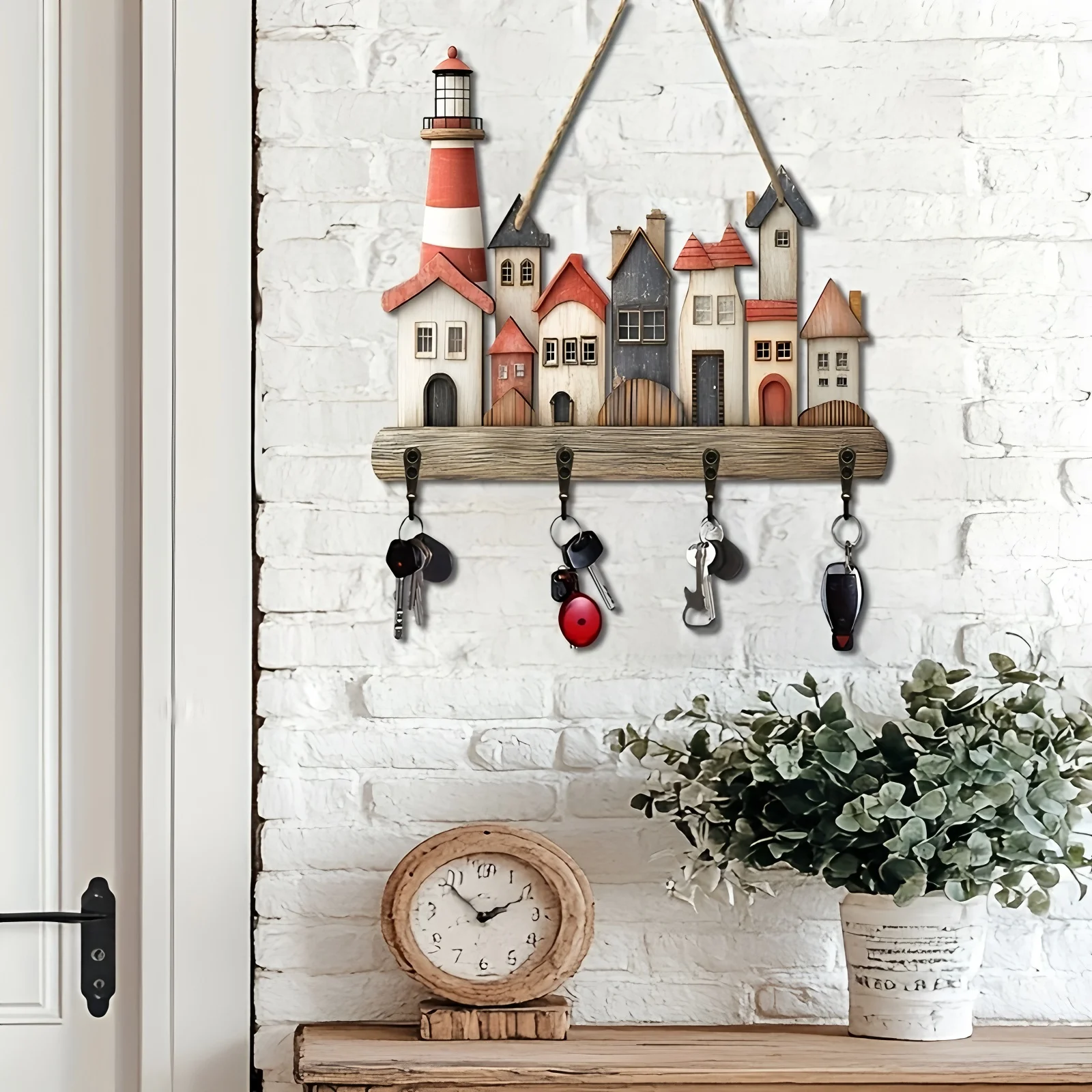 1 PCS 2D Wooden Hanging Decoration Seaside Lighthouse Town Wooden Sign Simple Key Hangers Wall Art Wall Decor Porch Decor