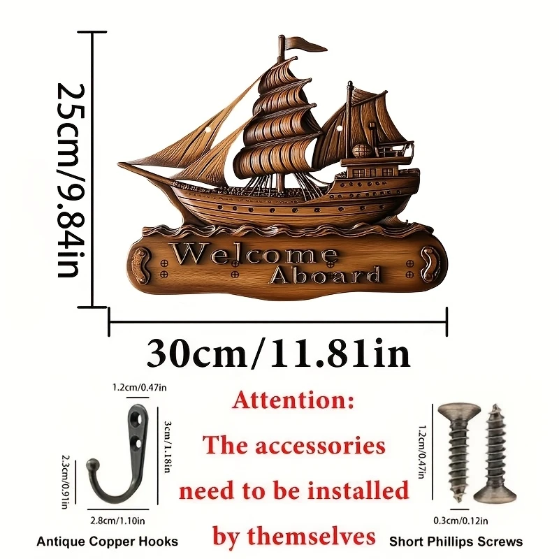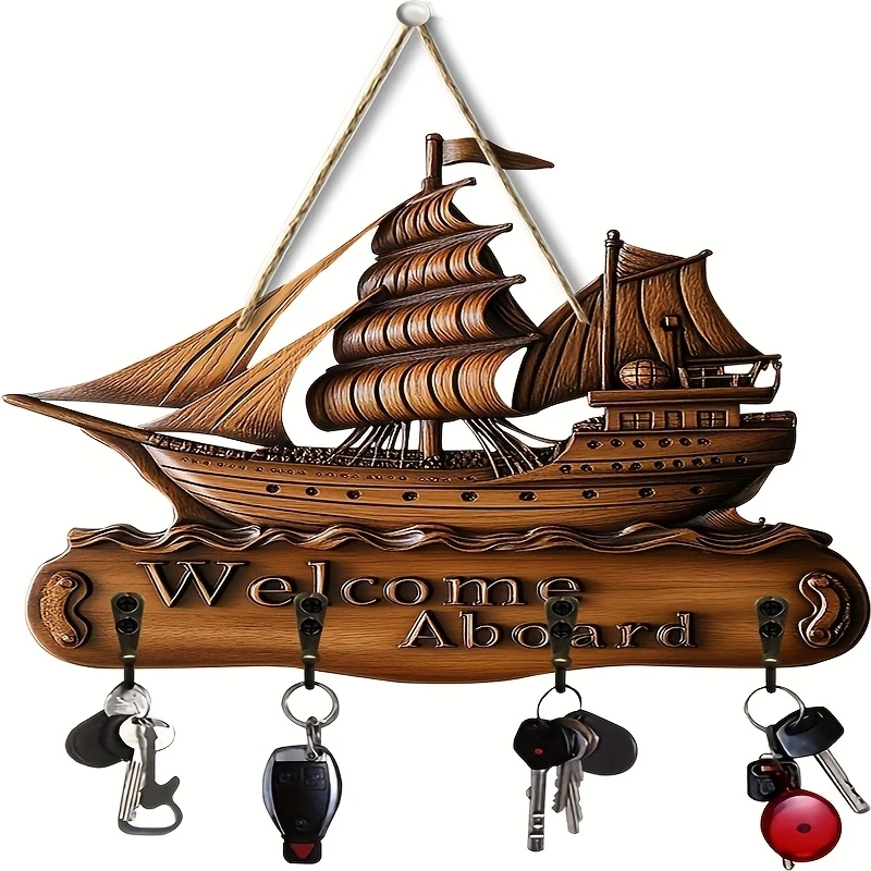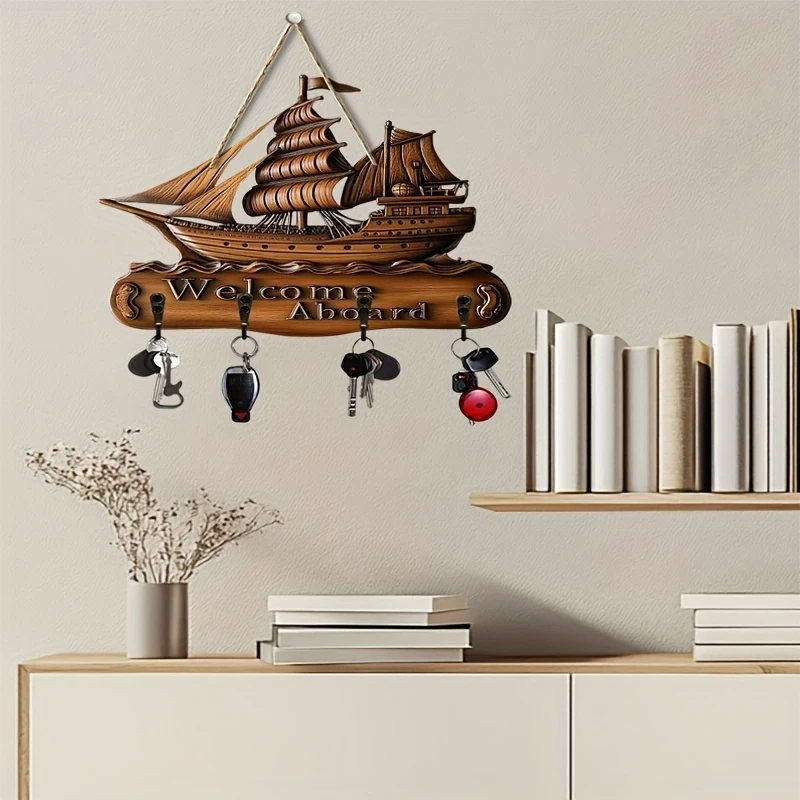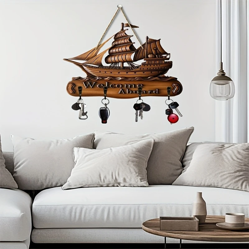 1 PCS Sailing Boat Wooden Sign 2D Hanging Wall Art with Household Key Hooks Minimalist Key Hangers Decorative Wall Piece