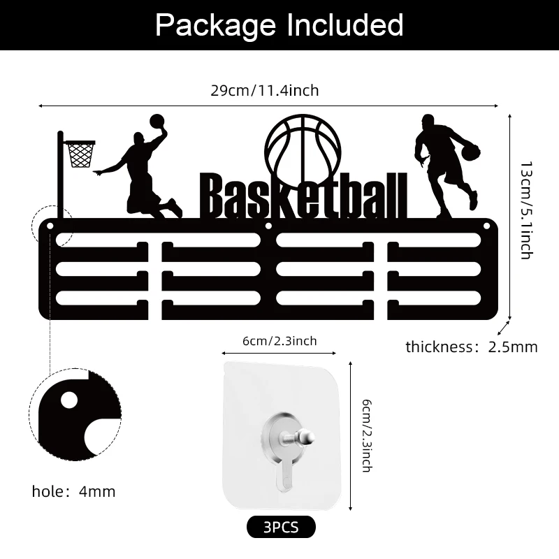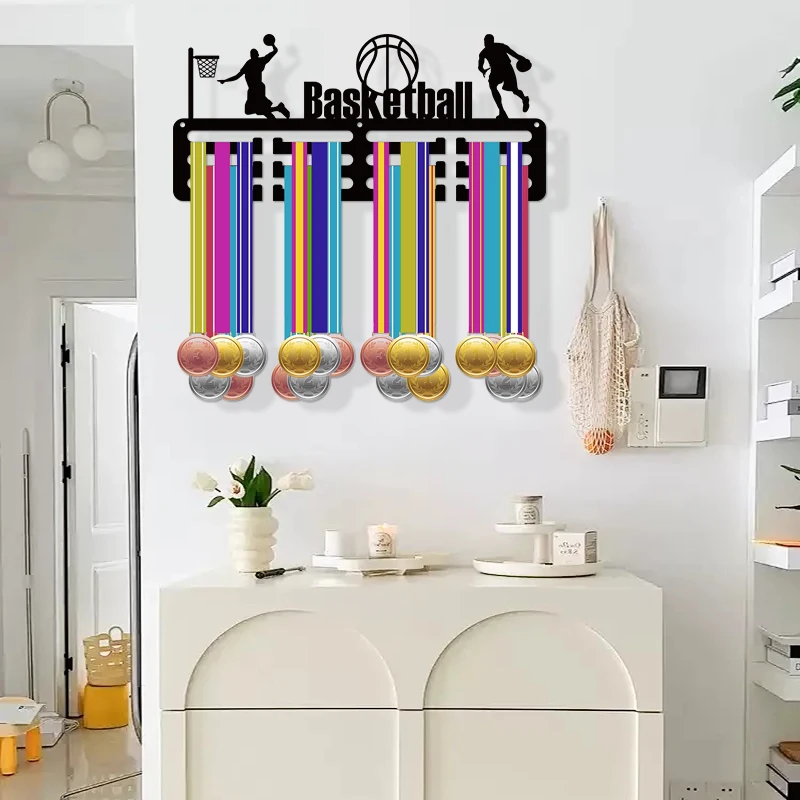 1pc wall mounted basketball medal display stand with multiple hooks, perfect for competitions and sports, used for installing an