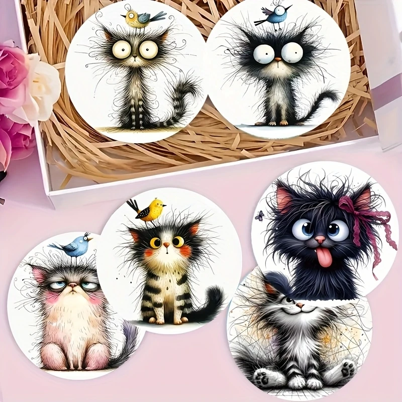 6 Pieces 2D Wooden Coasters Cute Black Cat Pattern Theme Desktop Heat Mats Home Decor Coffee Cup Coasters Office