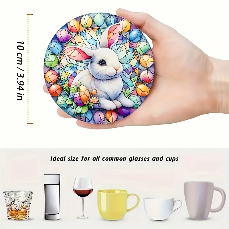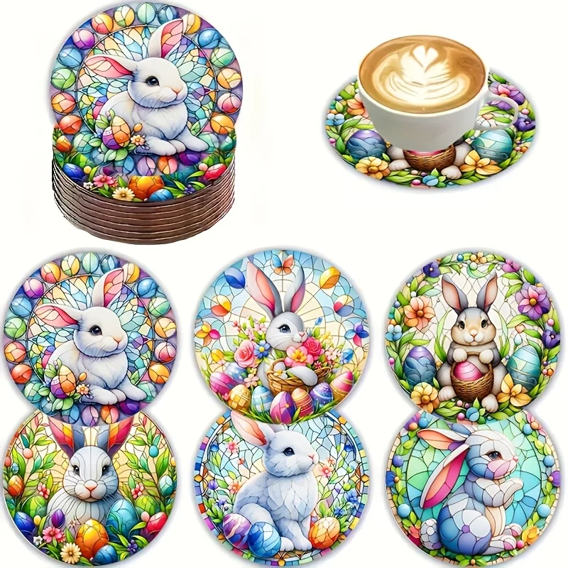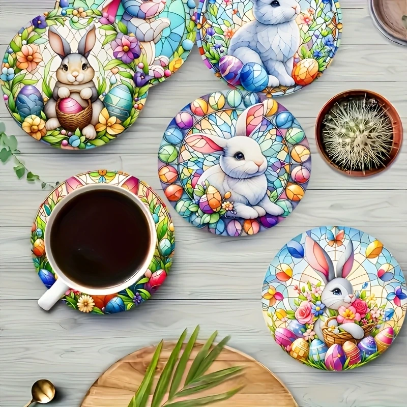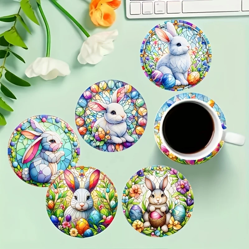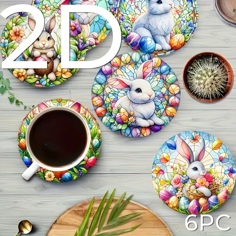 6pcs Round Wooden Art Coasters 2D Floral Rabbit Theme Heat Resistant Non-Slip Home Decor Multifunctional Gift Set